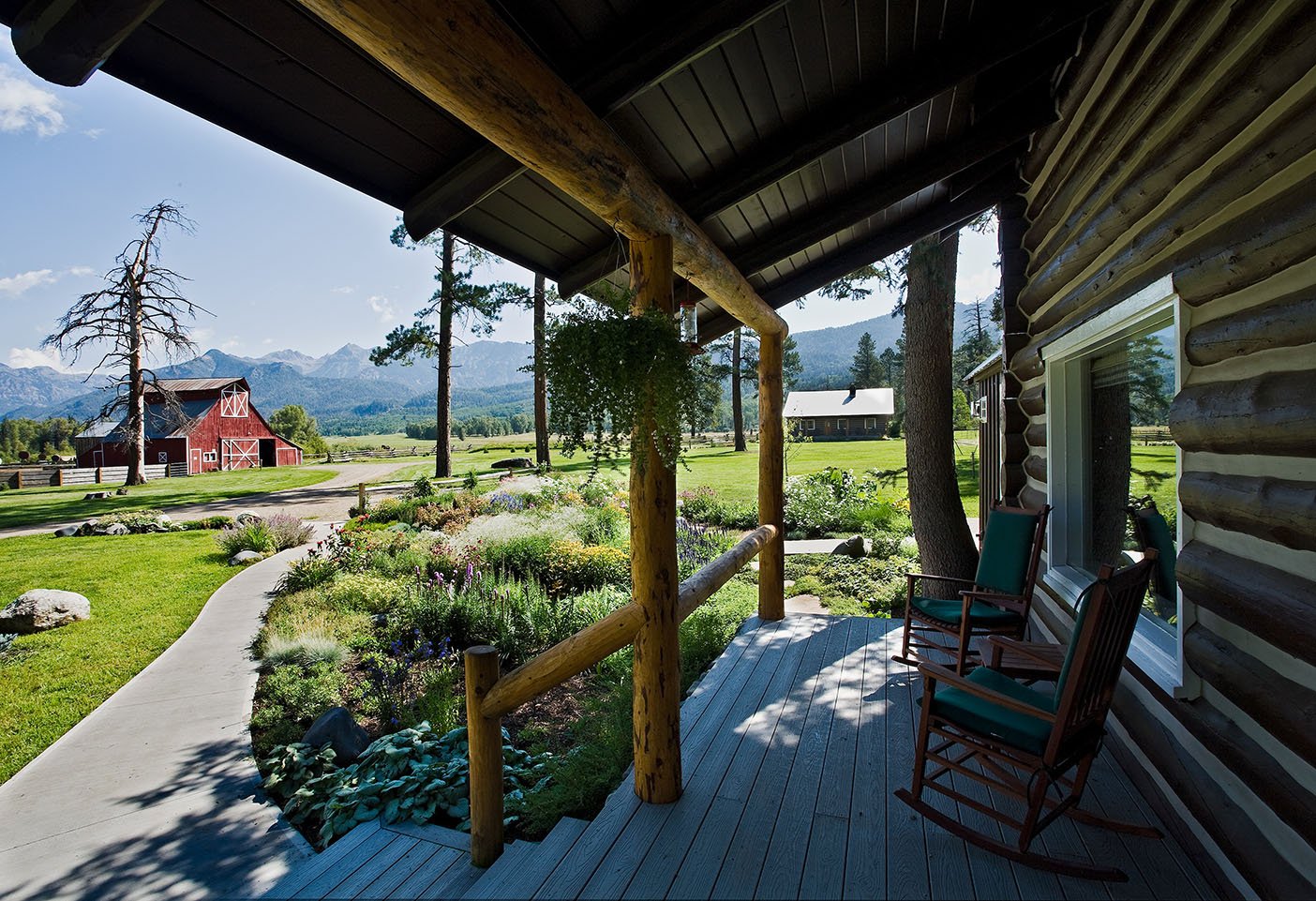 The Log Cabin is our original 1940s four bedroom three bath bungalow, thoughtfully renovated to comfortably sleep seven while keeping its classic ranch character. Oriented to look down the valley toward the mountains, the front porch is made for slow mornings with sweeping views, relaxed seating, and an amazing garden just outside. Inside, you will find a full eat in kitchen for easy meals, a dining room framed by dramatic scenery, and a cozy living room anchored by a working fireplace for evenings back from the river.